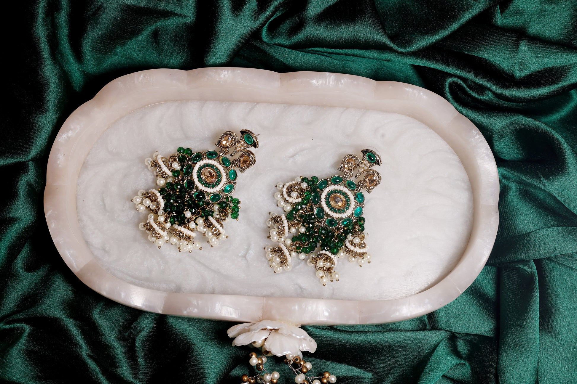 Add timeless elegance to your look with these kundan chandelier earrings. Featuring a rich combination of green stones, pearl clusters, and sparkling kundan work, these earrings are designed to make a statement. The intricate detailing with layered pearls and teardrop motifs enhances their regal charm. Perfect for brides, weddings, and festive occasions, these earrings pair beautifully with lehengas, sarees, and anarkalis.