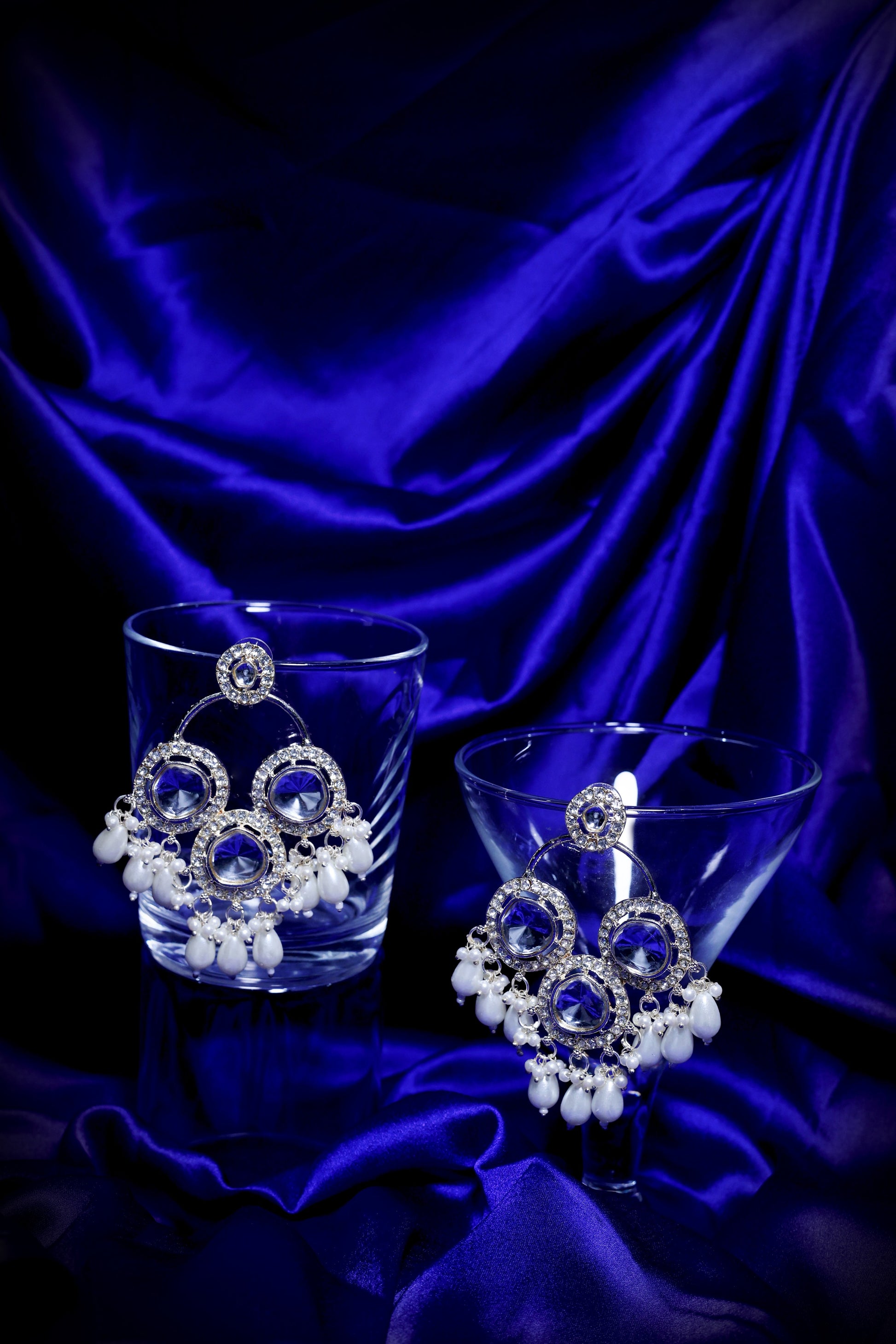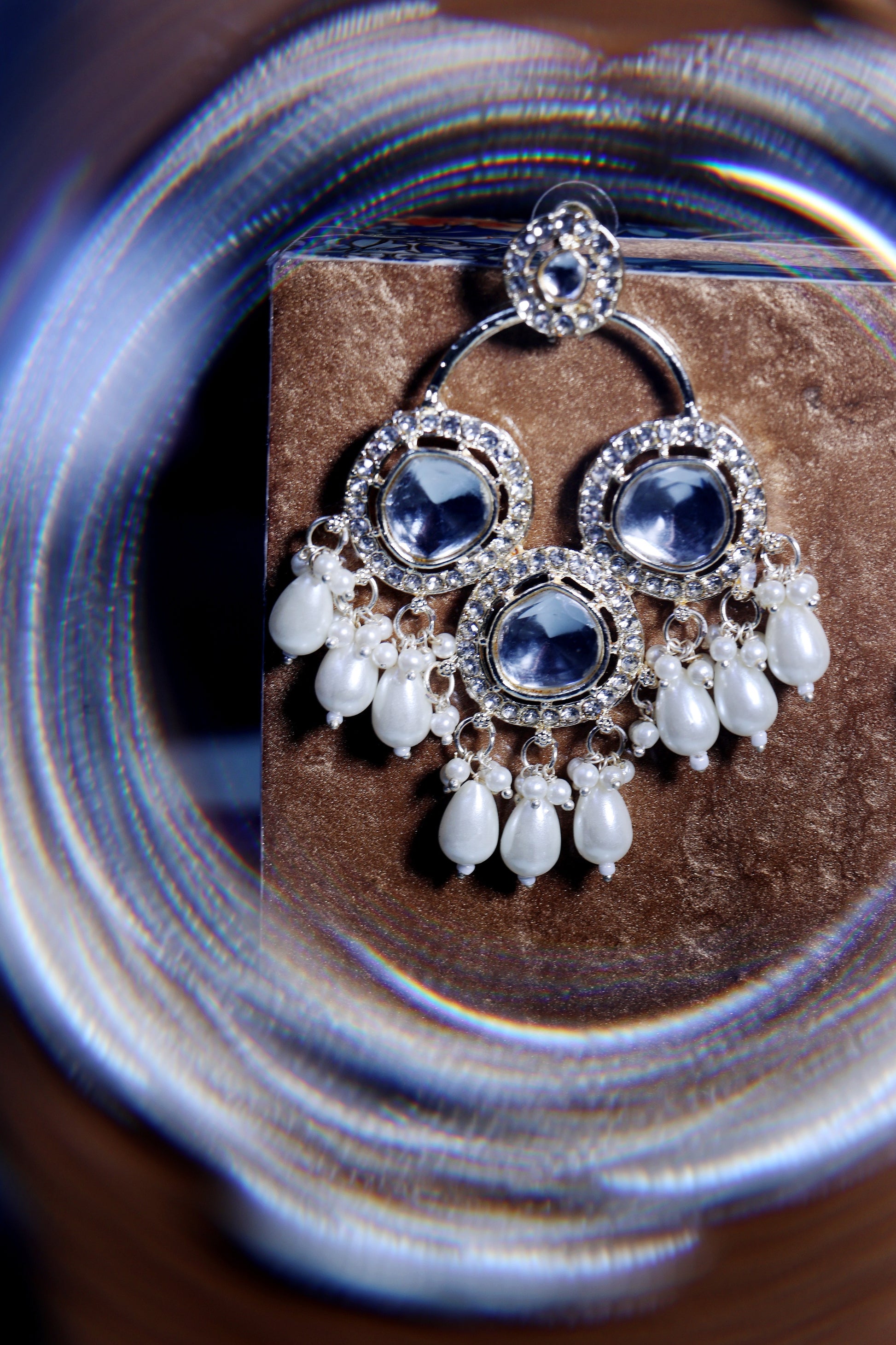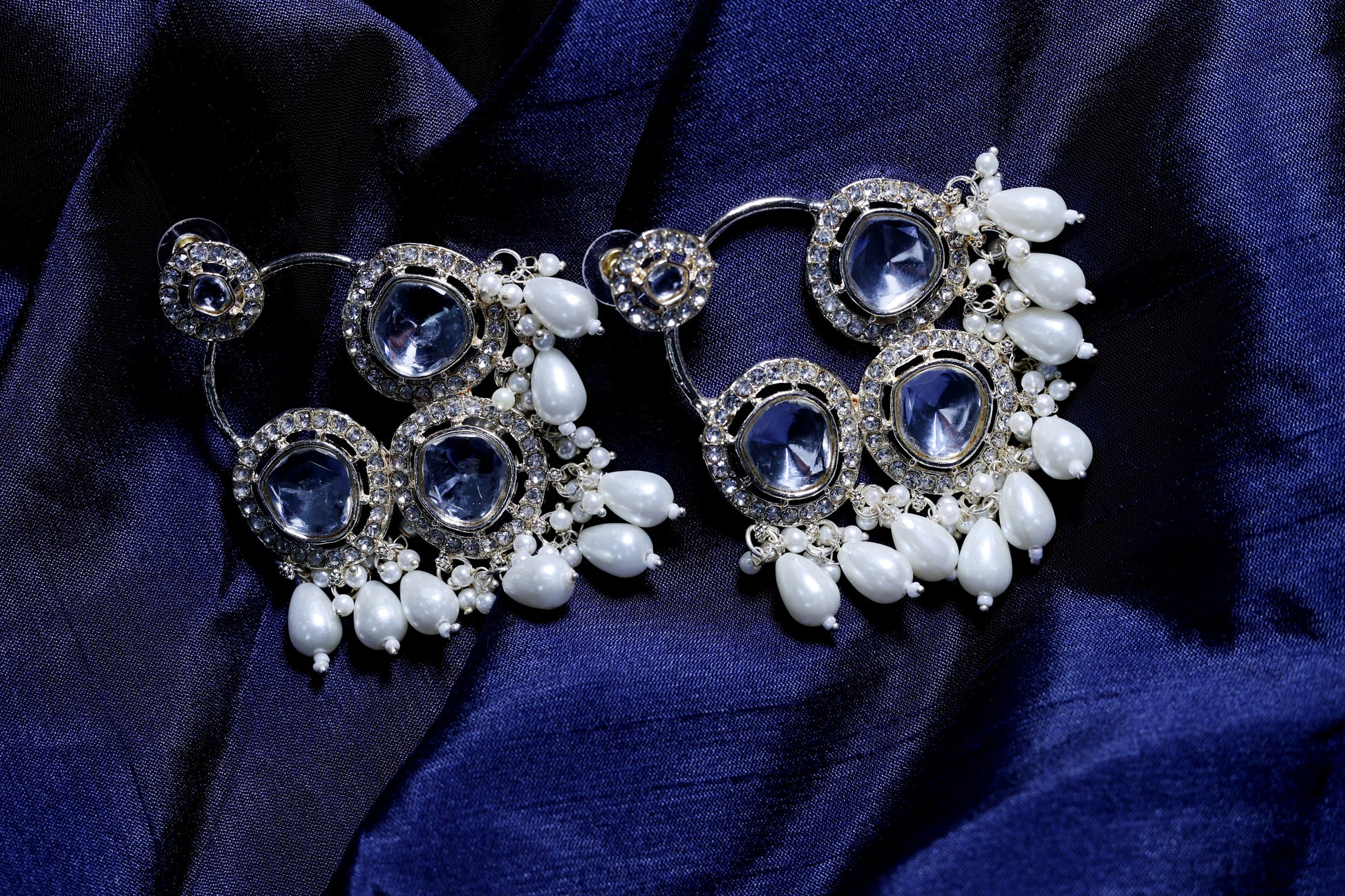 Make a statement with these kundan-inspired hoop earrings featuring dazzling stones surrounded by intricate detailing. The design is beautifully enhanced with delicate pearl drops, adding grace and sophistication. These earrings are a versatile choice for traditional wear, from weddings to festive celebrations, while also pairing beautifully with contemporary ethnic outfits.”